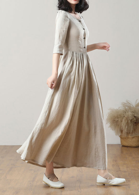Açık Bej Retro %100 Organik Keten Elbise