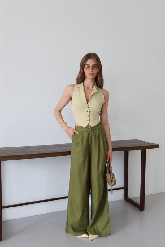 Yaz Yeşili %100 Organik Keten Yüksek Bel Pantolon