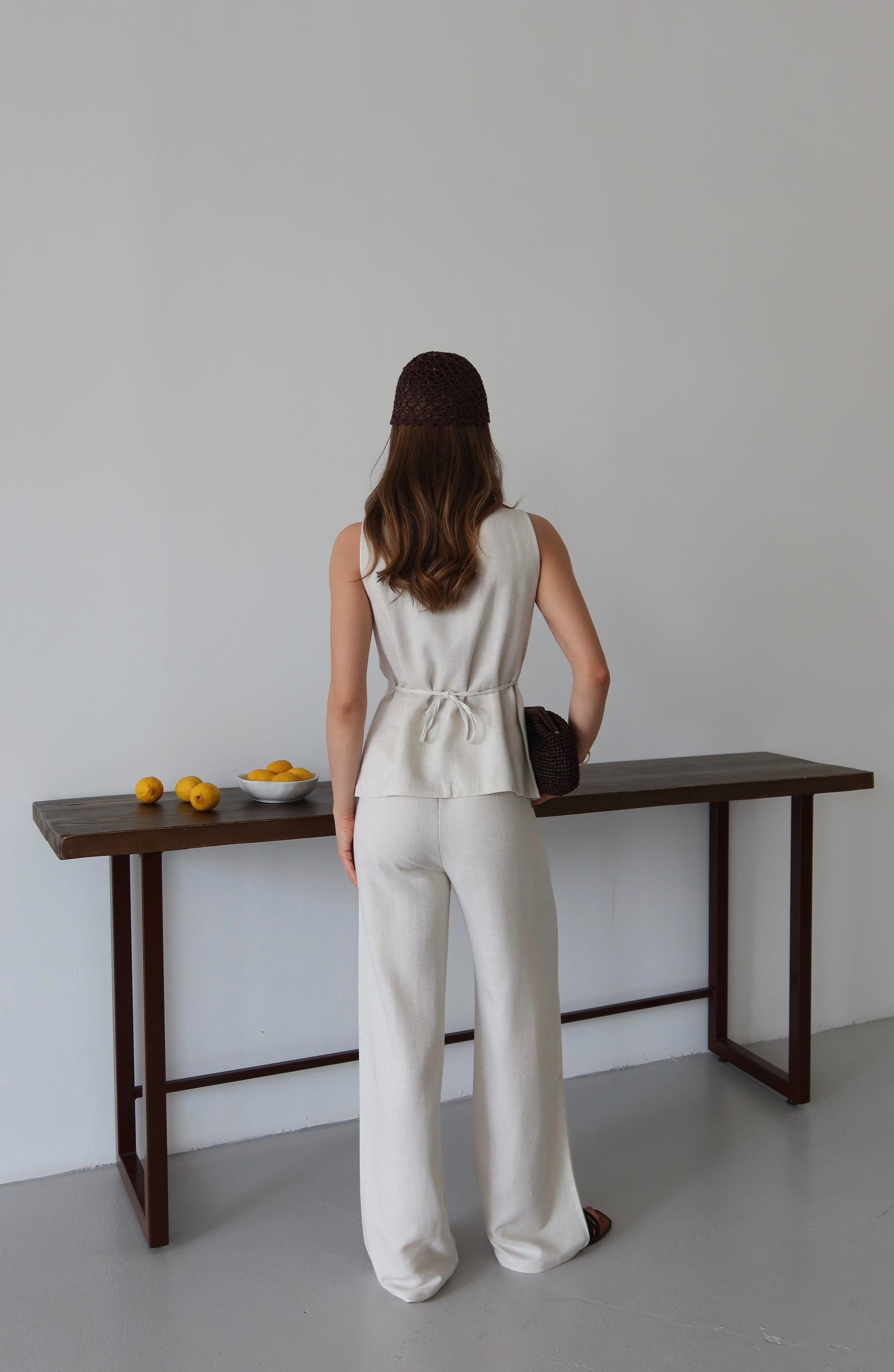 Doğal keten kumaştan üretilen bu şık yelek-pantolon takımı, zarif tasarımı ve rahatlığıyla öne çıkıyor. Yeleğin arkasındaki ip detaylı bağlama özelliği, hem şıklığınızı hem de kişisel stilinizi vurgular. Hafif ve nefes alabilir keten kumaşı, yaz aylarında cildinize dost bir seçenek sunarken, pantolonun modern kesimiyle mükemmel bir uyum yakalar. Hem günlük yaşamda hem de özel davetlerde rahatça tercih edebileceğiniz bu takım, zarafeti ve rahatlığı bir arada sunuyor
