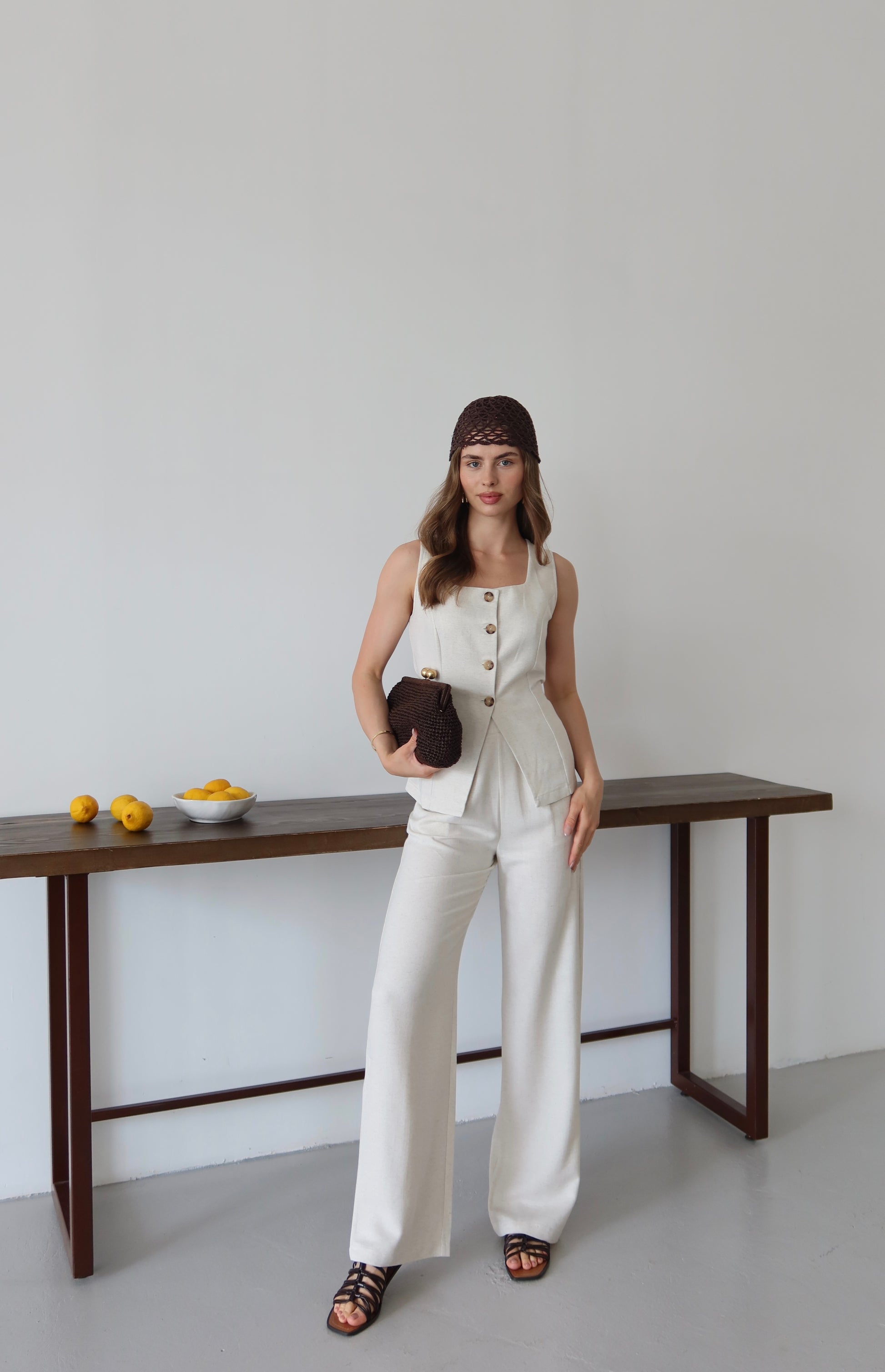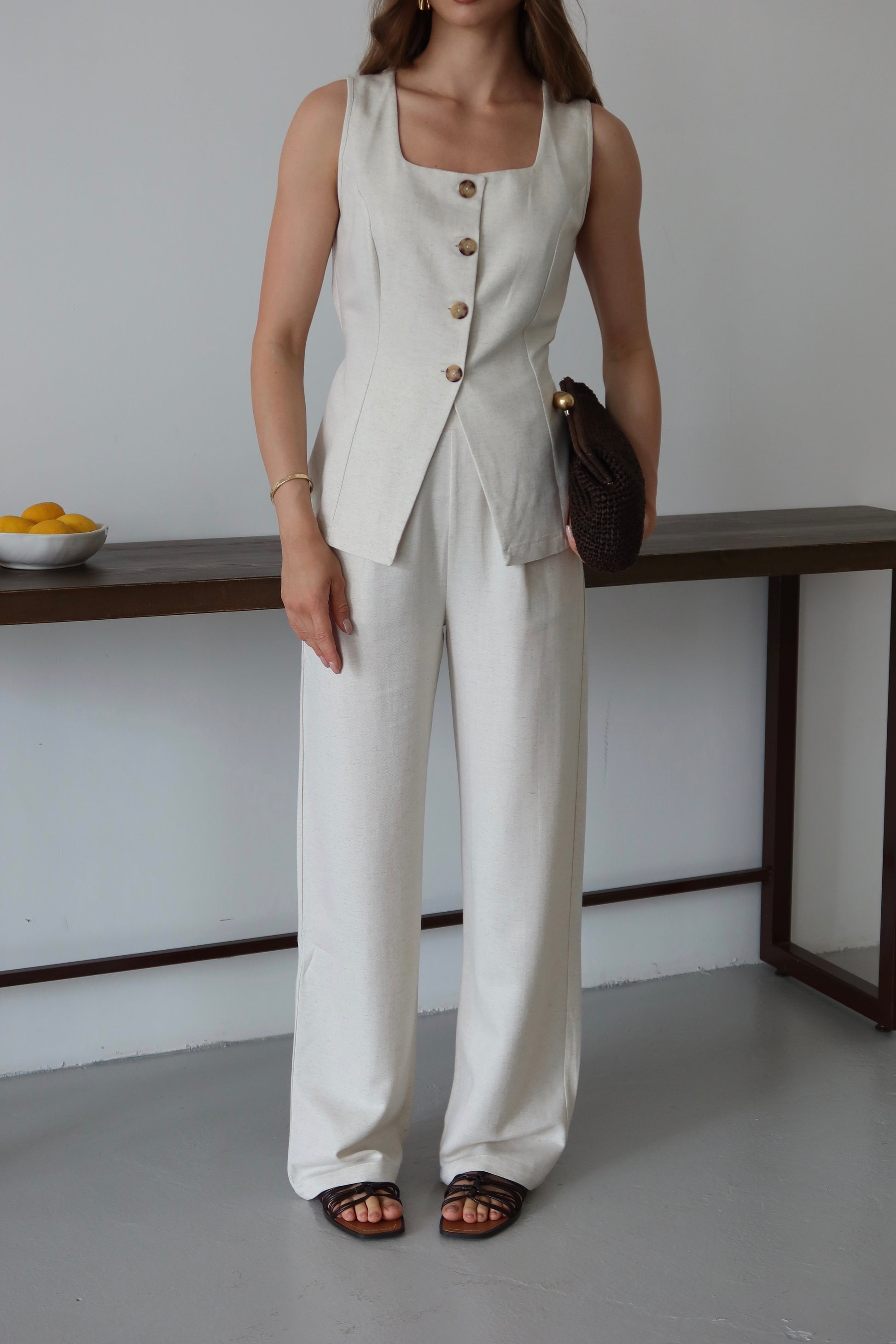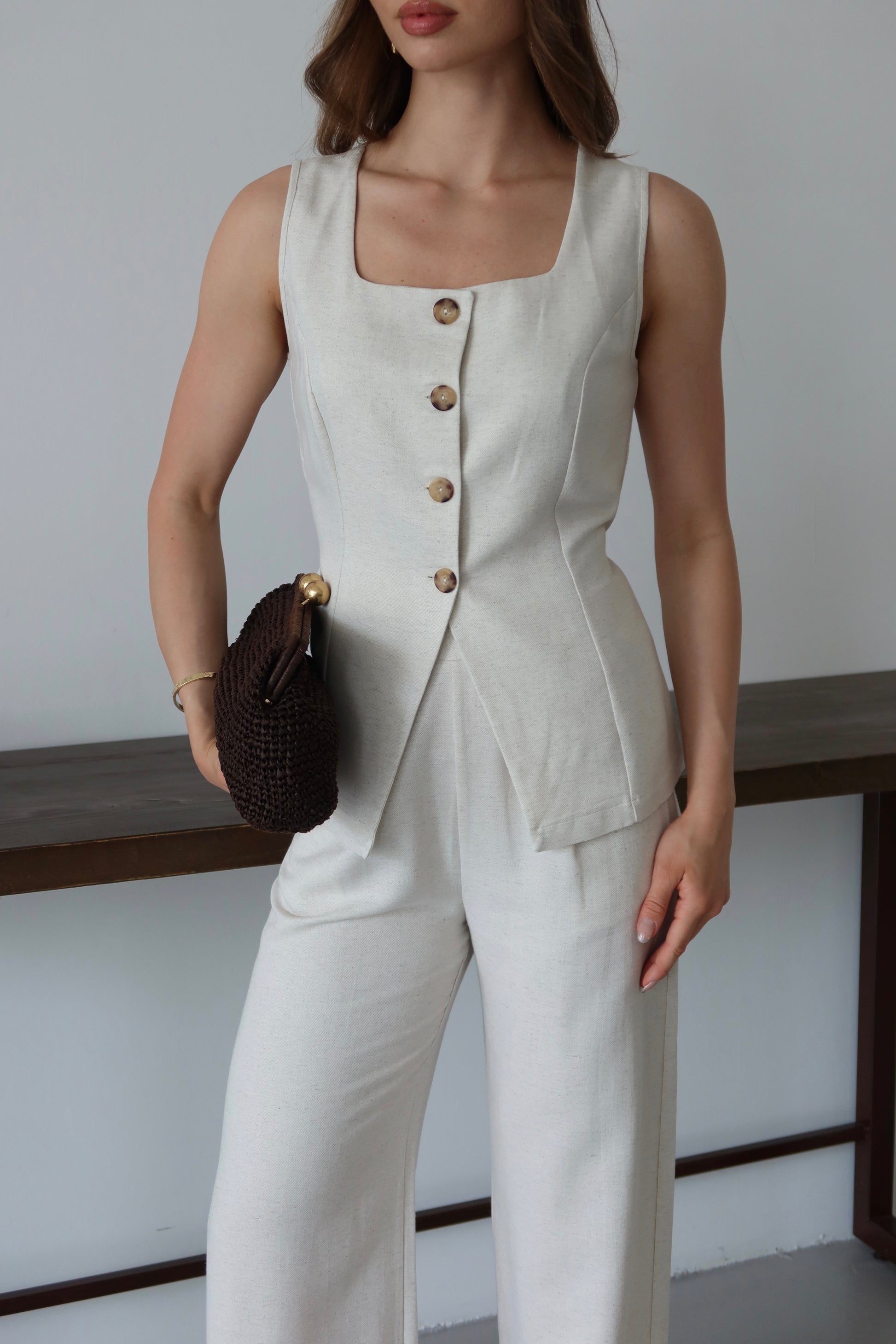Bej Keten %100 Organik Keten Premium Yelek-Pantolon Takım