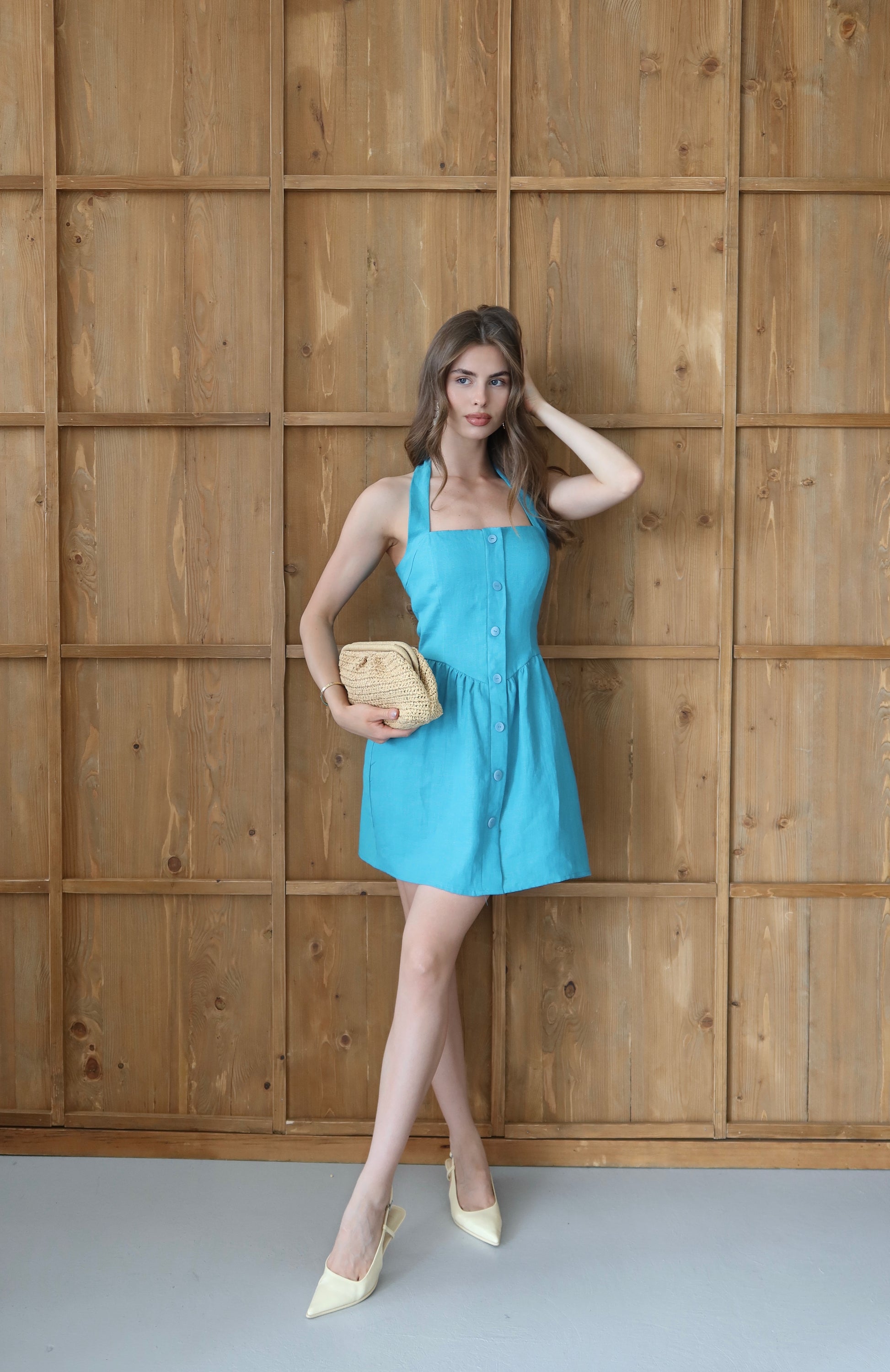 Mavera elbise, doğal dokusuyla yaz aylarının vazgeçilmezi olacak %100 keten kumaştan üretilmiştir. Cildi nefes aldıran yapısıyla serinlik sağlar, hafif ve konforlu yapısıyla gün boyu rahat bir kullanım sunar. Zarif düğme detayları, bele oturan formu ve sade şıklığı ile hem günlük hem özel davetlerde tercih edilebilecek modern bir tarza sahiptir.