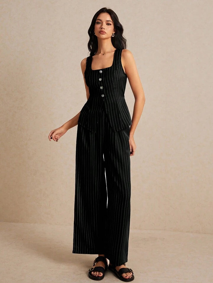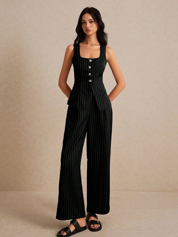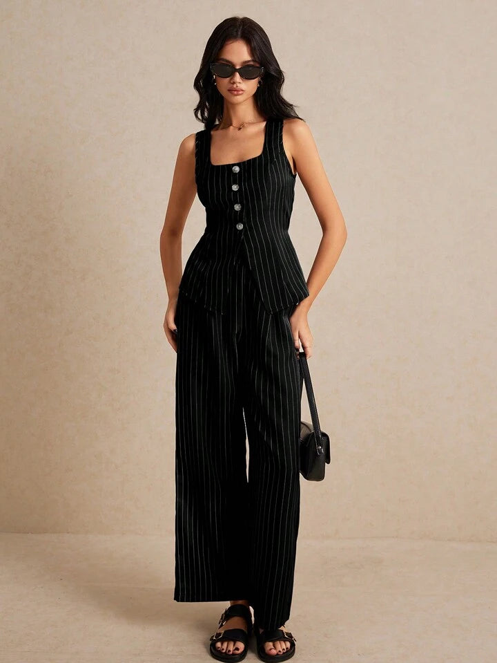 Siyah Çizgili Premium Kumaş Yelek-Pantolon Takım
